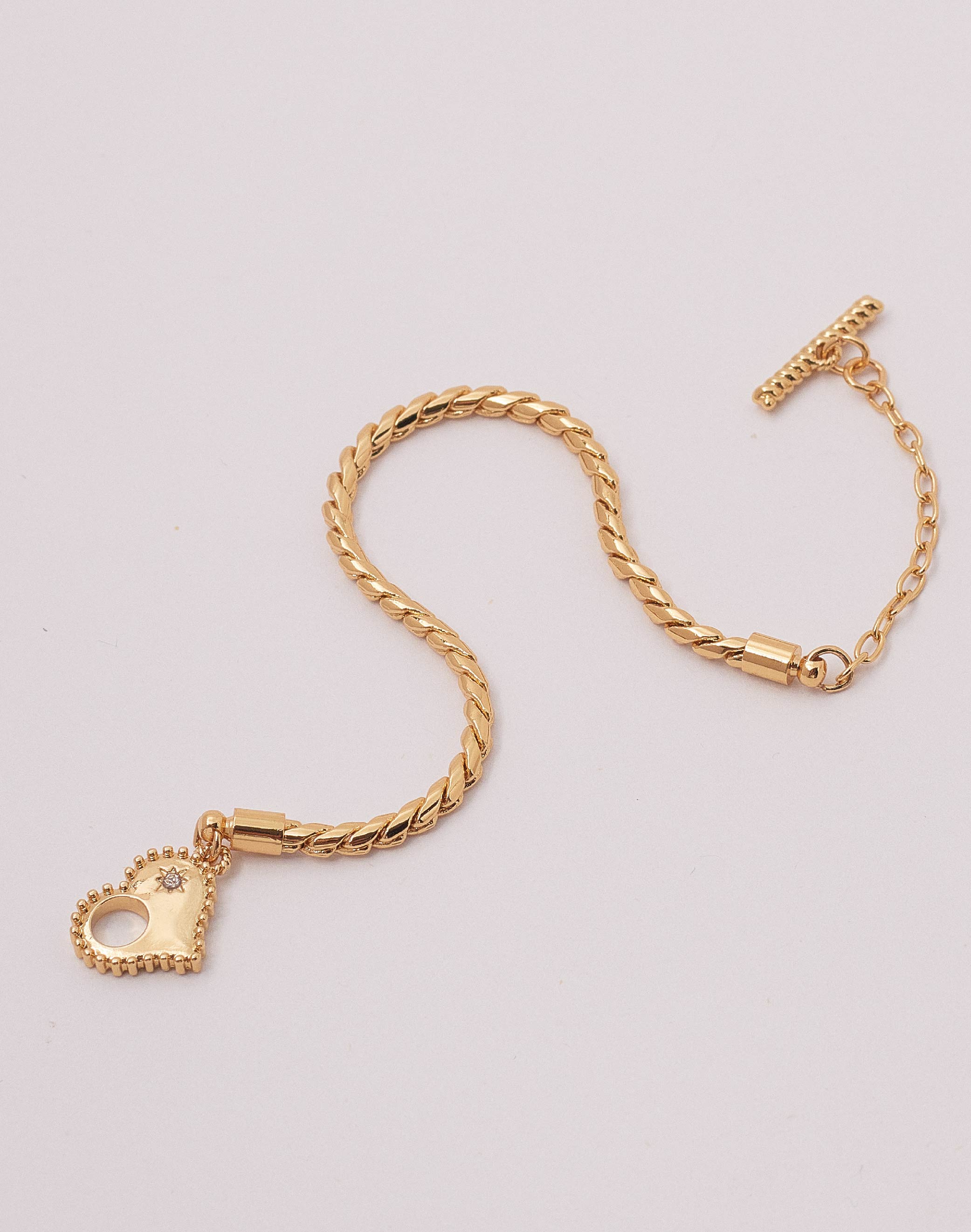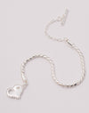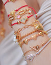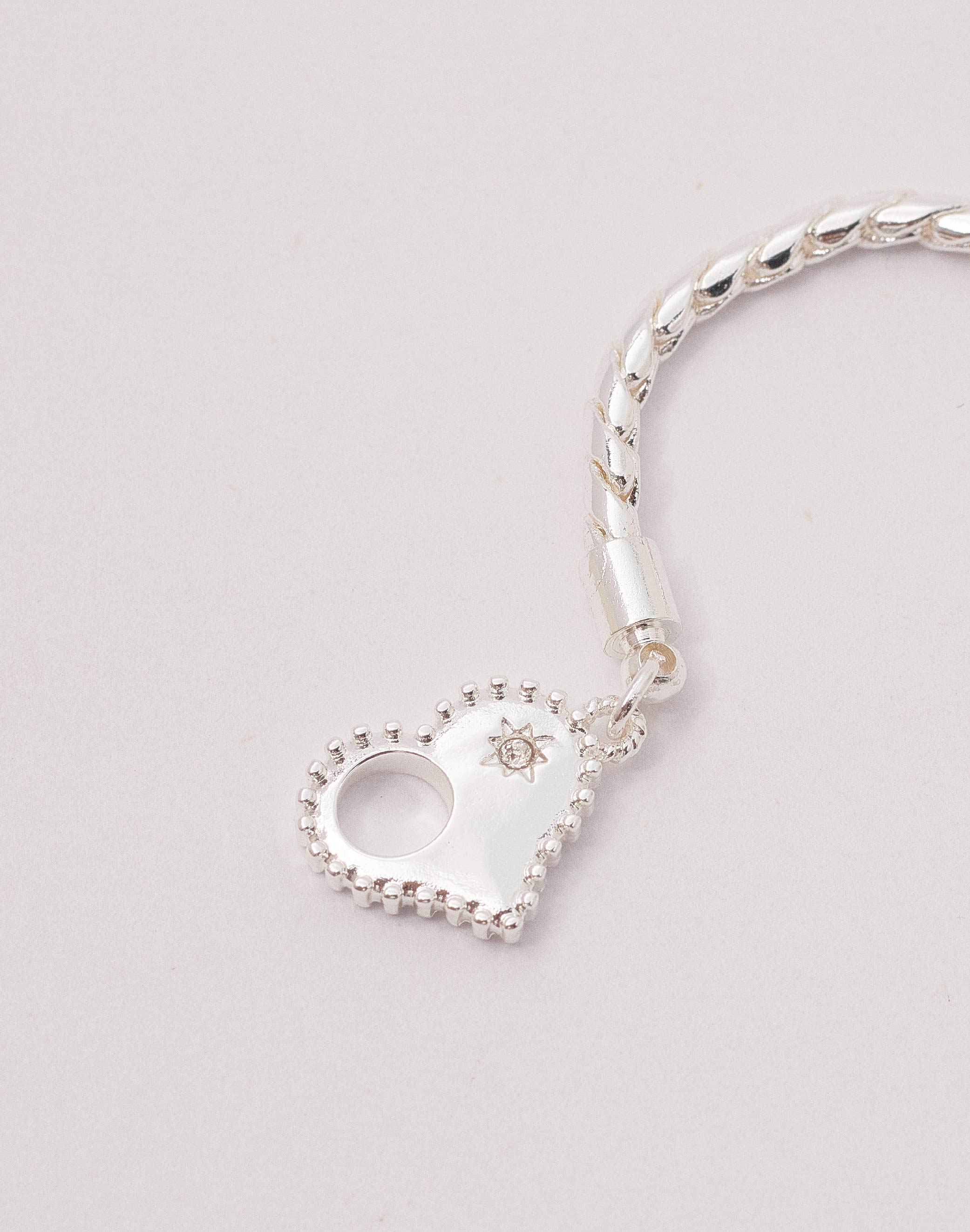 Un brazalete dorado o plateado que estabas esperando para coleccionar todos los charms de la suerte que debes tener cerquita siempre. La pulsera tiene un tejido snake y un broche en forma de corazón con centro destellante en tono clear.
