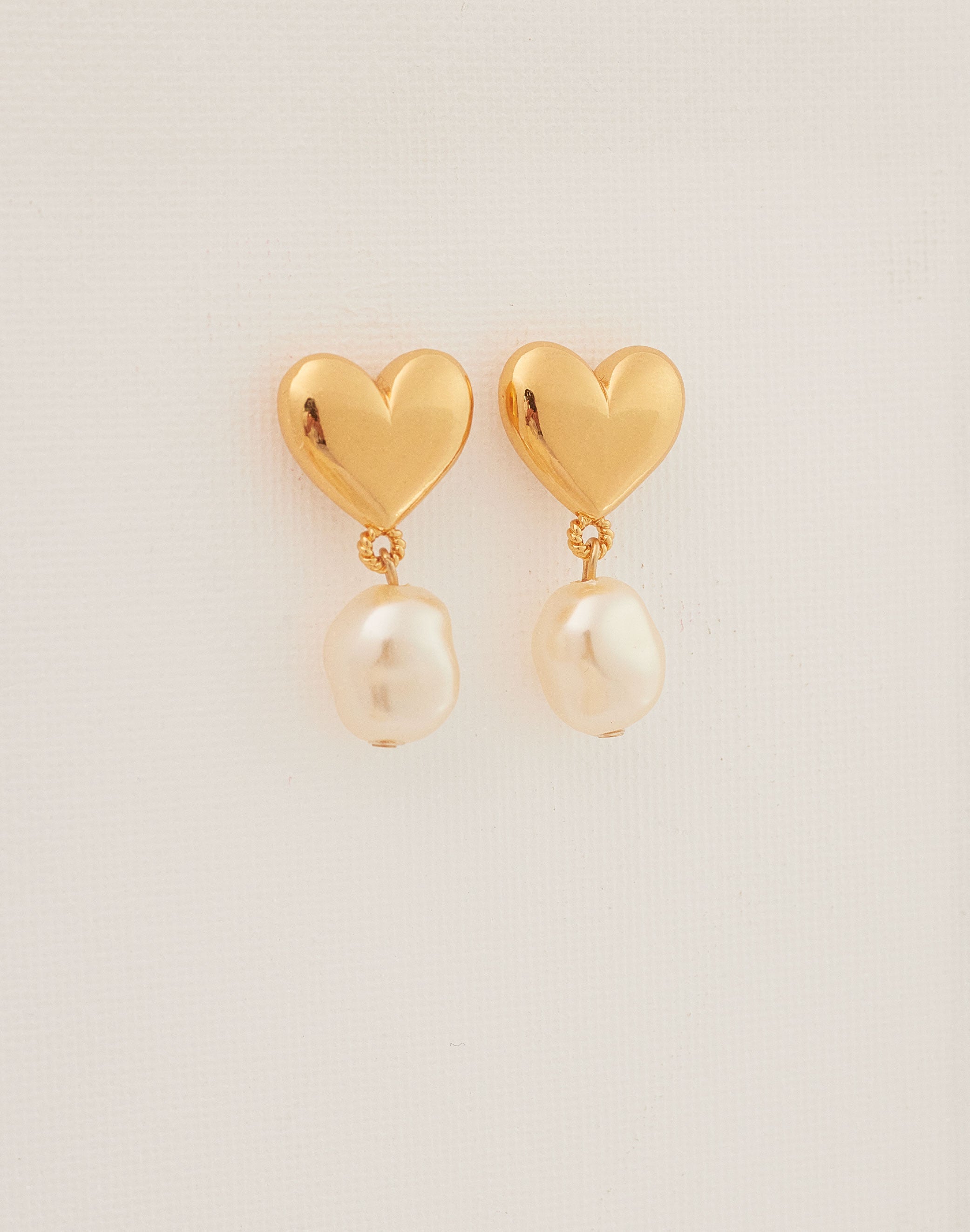 Un clásico renovado. Corazones dorados y perlas plásticas en una silueta romántica que nunca pasa de moda. Especificaciones: Baño en Oro 24k Medidas: 15 mm alto x 17 mm ancho....
