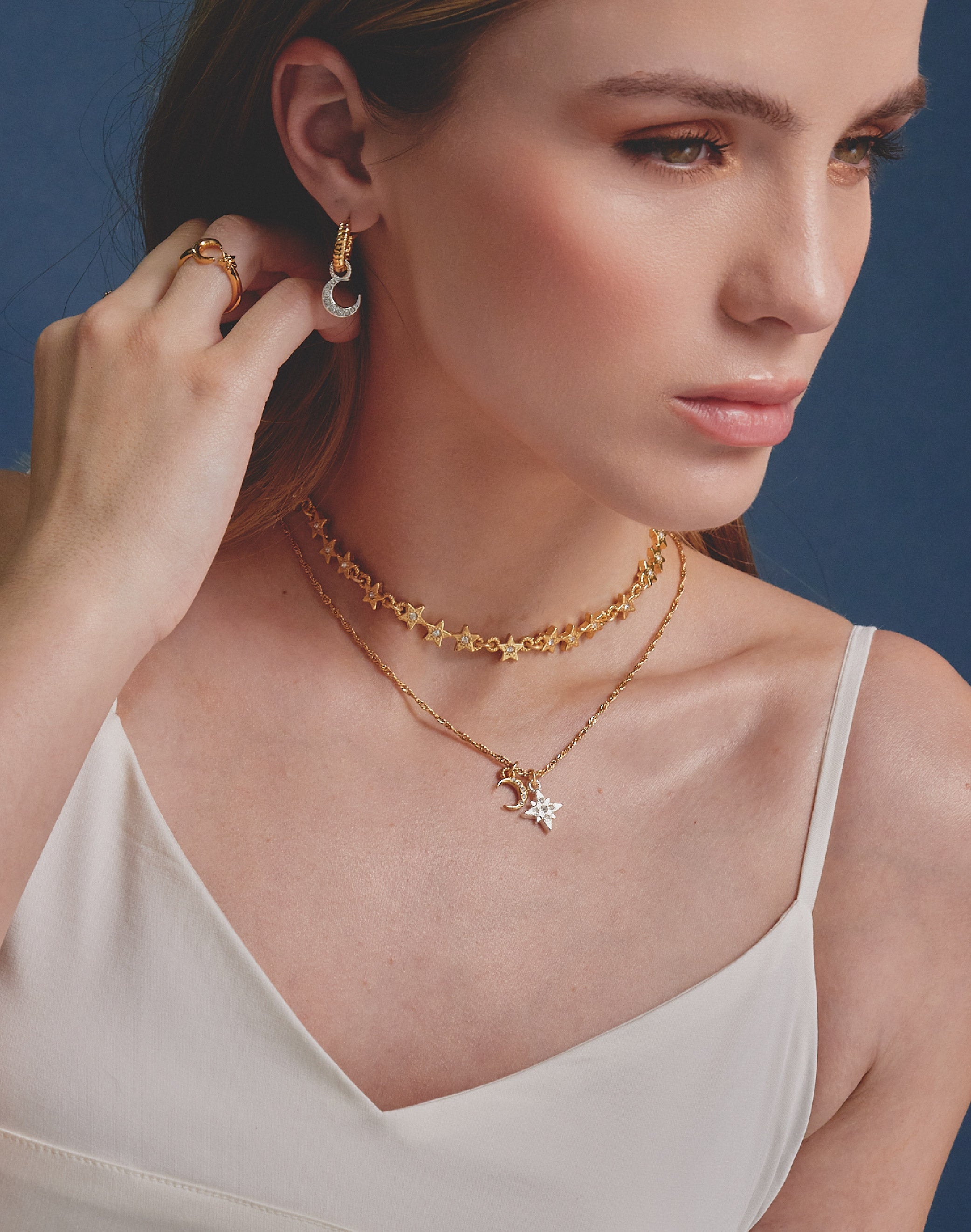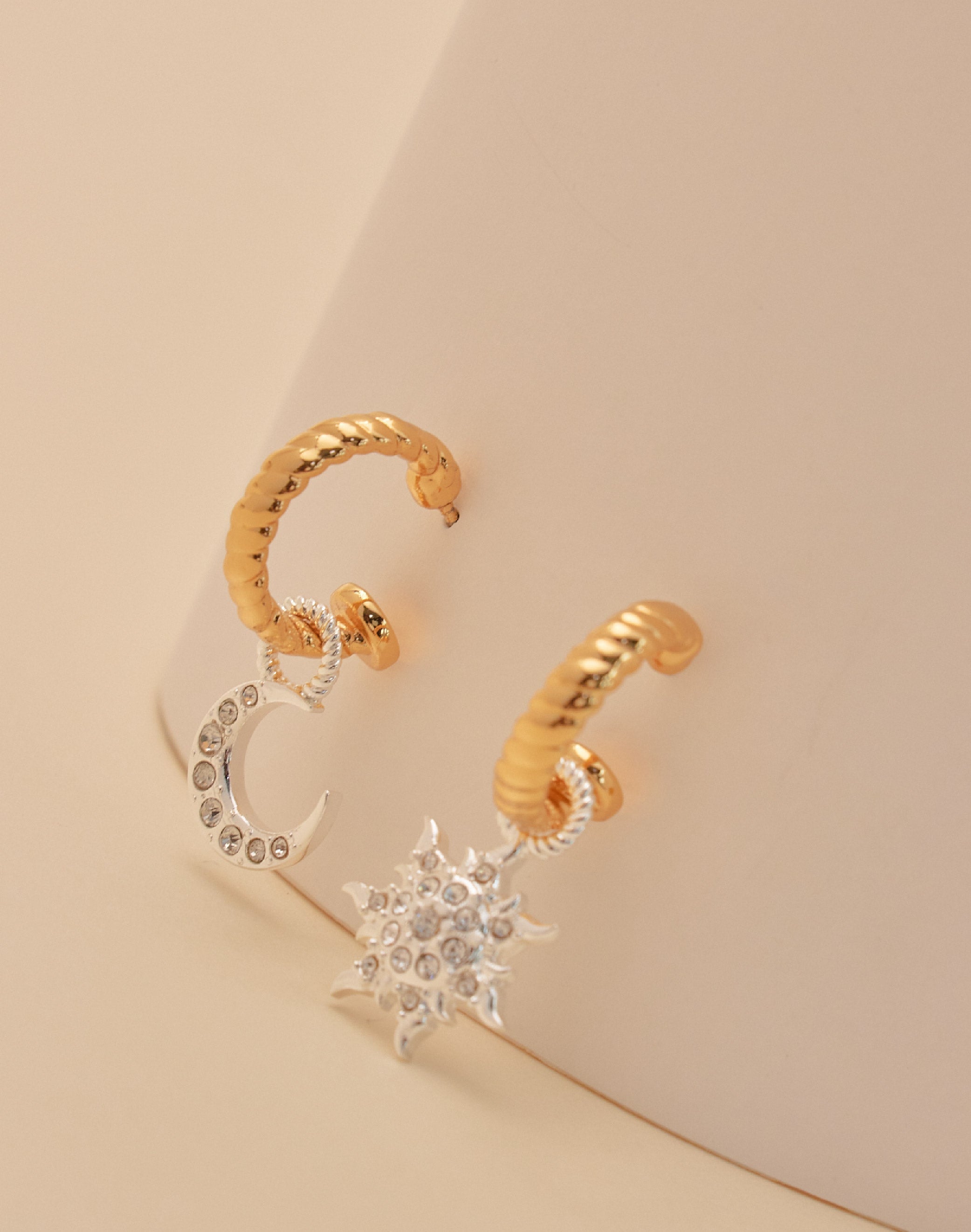 Estas candongas combinan el brillo del oro y la plata para un look único. Cada una lleva un dije removible: una estrella y una luna. Cambia los dijes cuando quieras y dale un toque especial a tu estilo con estas candongas.
