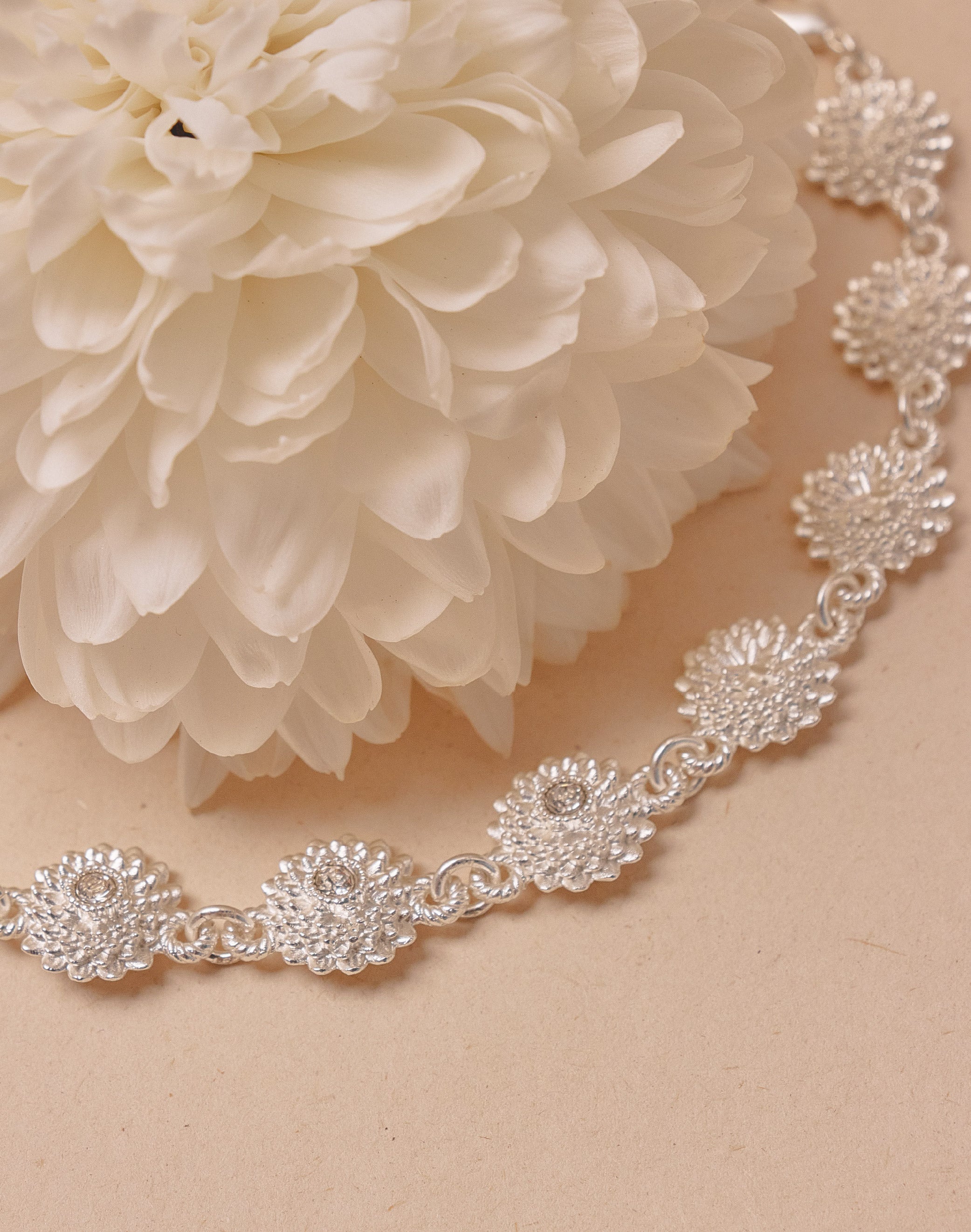 Inspirado en la simetría natural del crisantemo y sus patrones en espiral. Los cristales resaltan su estructura precisa y elegante, creando un set delicado pero protagonista.