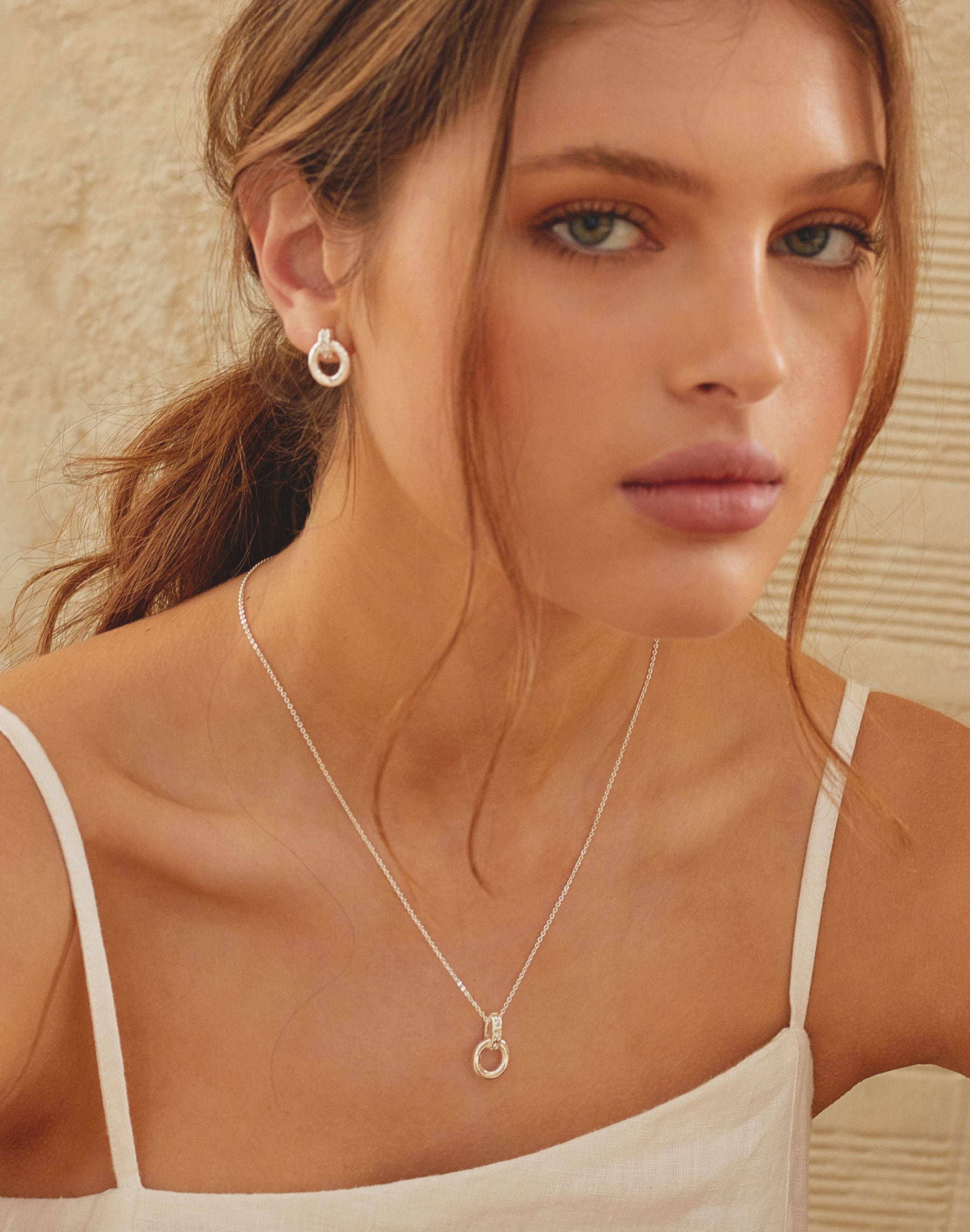 La versión en plata para amantes del brillo neutro. Este set es perfecto para días de oficina o noches minimal. Especificaciones: Incluye 1 collar y 1 par de aretes Baño...