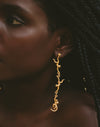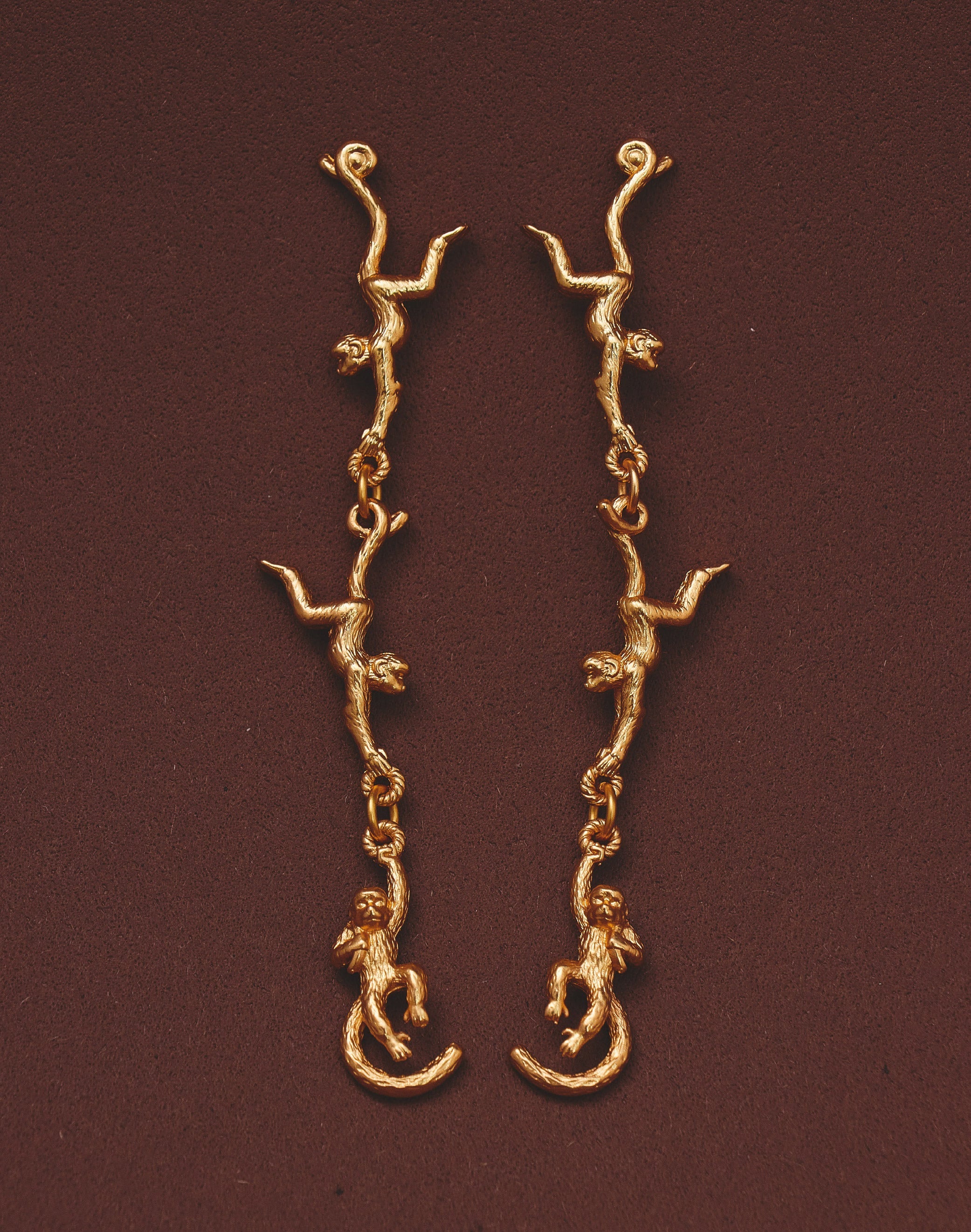 Estos pendientes representan al tití del Pacífico colombiano, una especie que habita los manglares y la selva húmeda de la región. Su diseño de tres monos colgantes crea movimiento y carácter, convirtiéndolos en una pieza llamativa y llena de simbolismo.