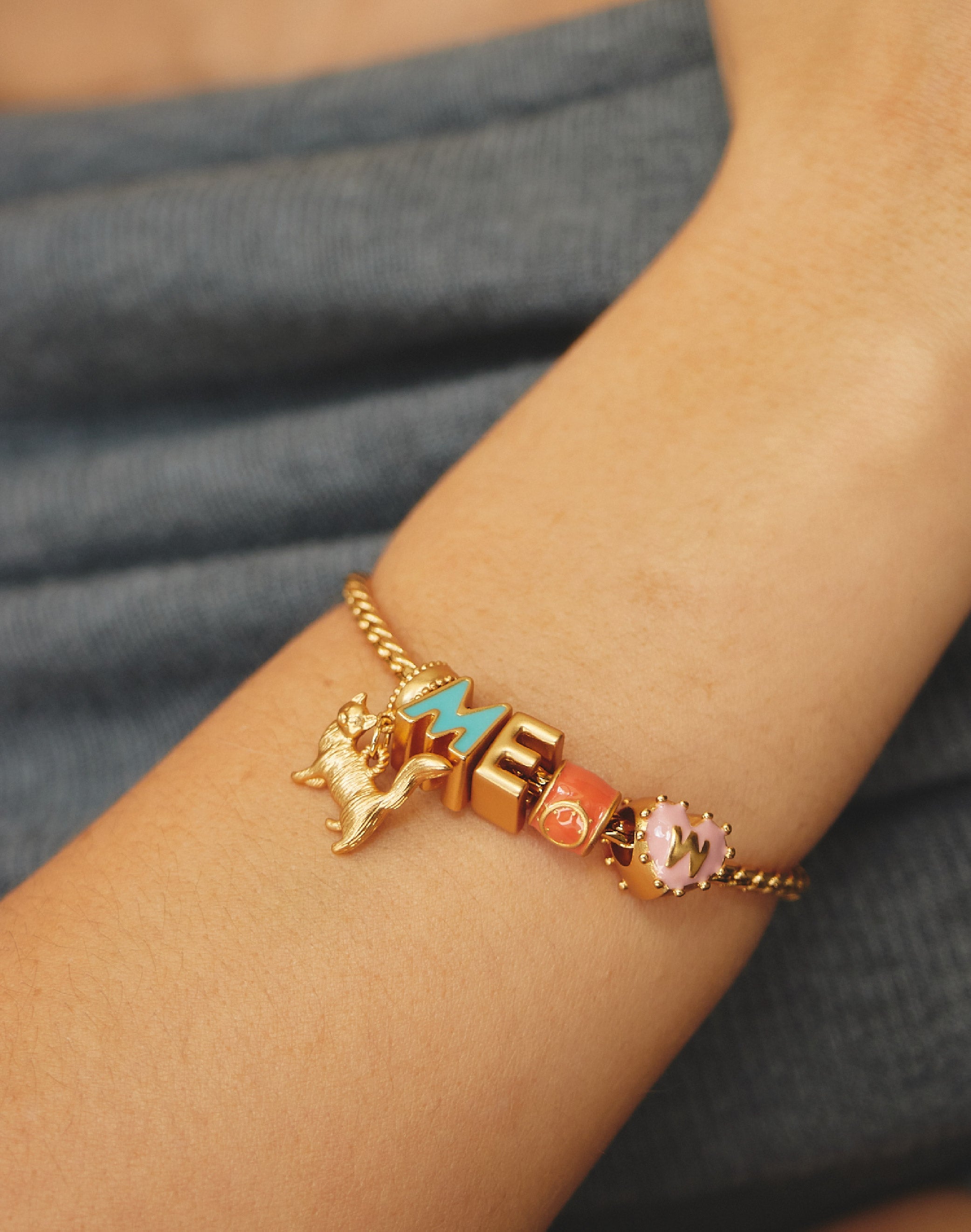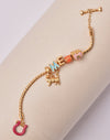 Una pulsera encantadora que combina elegancia y diversión, perfecta para destacar en cualquier ocasión. Con detalles de resina epóxica y un baño de oro semibrillante, esta pieza es ideal para quienes buscan un toque de brillo y estilo en su look diario.