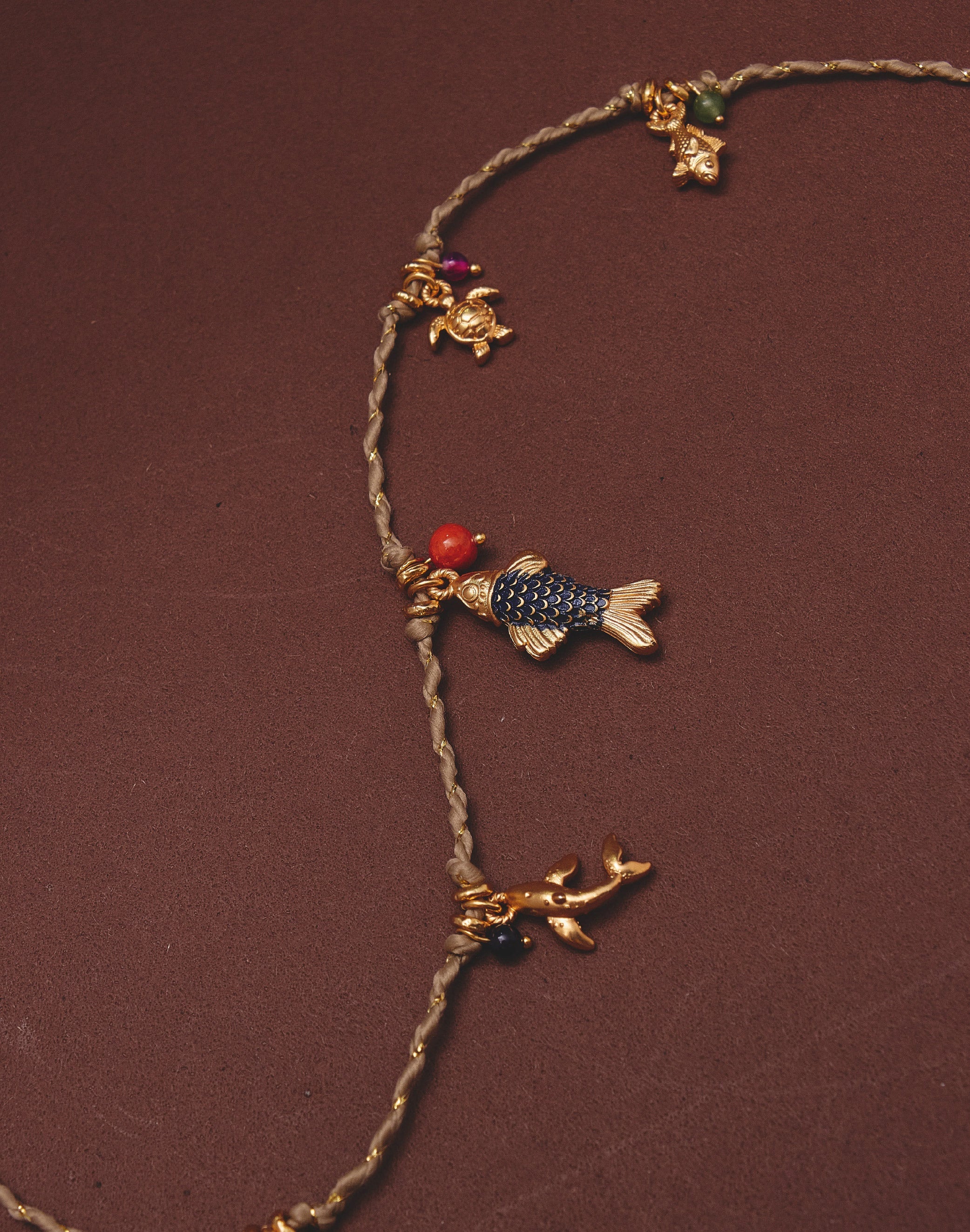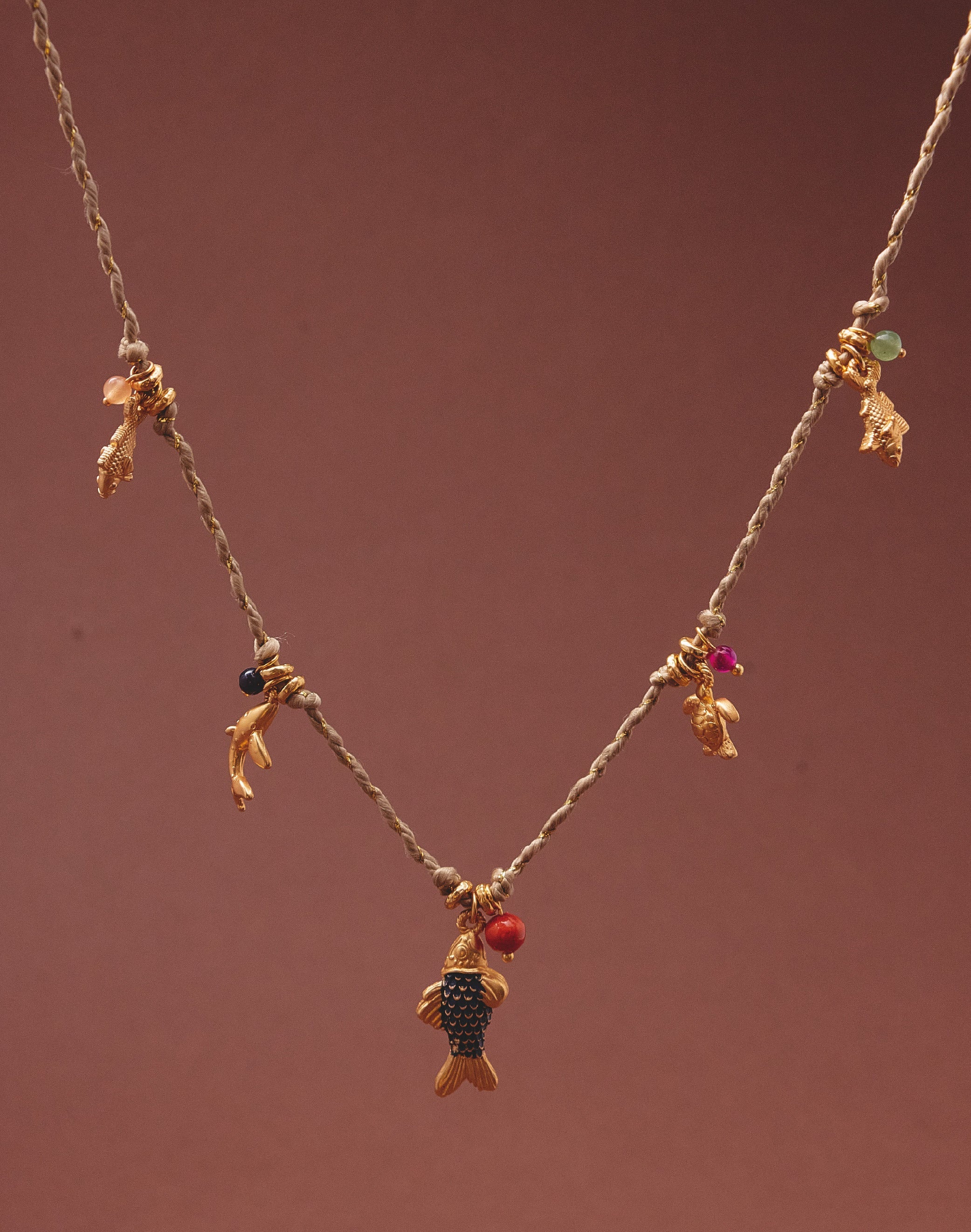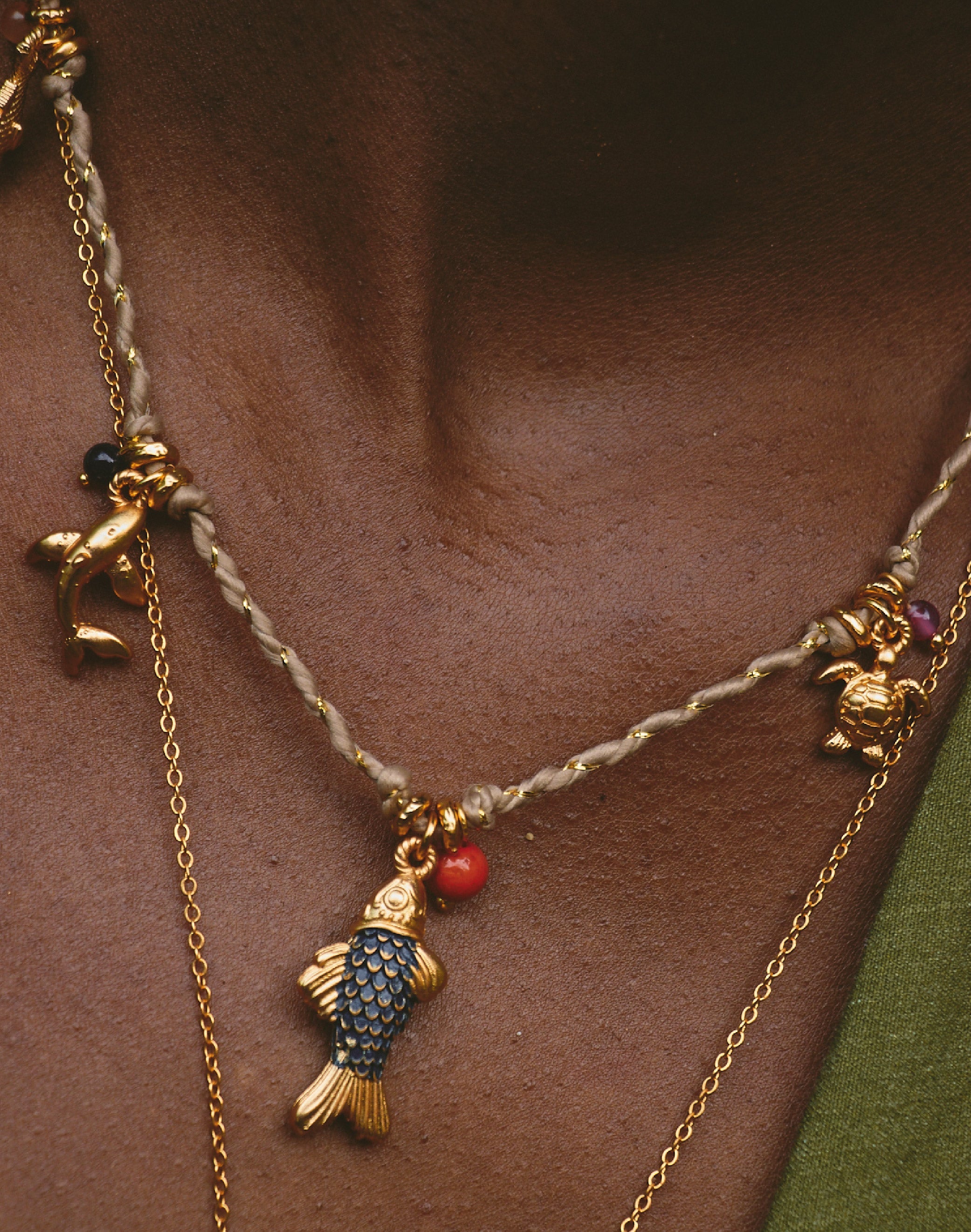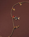 Un set que captura los colores cálidos del atardecer tropical del Pacífico. Este layering combina un collar corto con cordón lurex y múltiples dijes inspirados en la fauna marina, junto a un collar largo con dije de palmera que aporta verticalidad y movimiento.